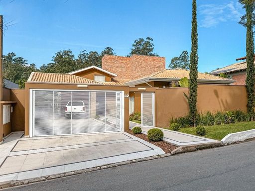 * Linda casa moderna integrada impecável, com vista maravilhosa e excelente acabamento. * Imóvel construído por profissionais da construção civil da família. * Foi feito para morar, com material de primeira linha. * Excelente estado de conservação, com manutenções permanentes em todas as áreas. * Possuem todos os projetos de Construção, Elétrica e Hidráulica. * Imóvel repleto de armários. * Portas e janelas em PVC, com persianas elétricas e acústicas reforçadas. * Pisos em porcelanato, tábuas largas e cimentício antiderrapante na área externa. * Louças e metais de qualidade. * Jardim com paisagismo formado e frutíferas: jabuticaba, mamão, amora, mexerica, maracujá, laranja, limão, romã e pitanga. * 3 acessos: social, lazer e serviço. * Entrada social por uma porta de madeira pivotante. * Lavabo com porta de correr e tampo em silestone. * Escritório planejado com porta para o quintal. * Hall da escada panorâmico envidraçado. * Escada revestida em fulget, com guarda corpo de metal. * 4 amplas suítes planejadas com armários, bancadas, estantes, persianas elétricas, terraços e vista. 3 suítes com ar condicionado. Sendo a master no térreo com grande closet. * Banheiros com tampos em silestone, espelho, gabinete e box de vidro. Sendo a máster com 2 cubas e hidro. * Living para 4 ambientes integrados, voltados para uma grande varanda gourmet com vista maravilhosa. * Estar, lareira em canjiquinha, jantar e bar. * Varanda gourmet integrada ao living e cozinha, com espaço para churrasqueira portátil, bancada e vista. * Copa cozinha planejada com gabinetes, bancadas em silestone, 2 cubas inox e despensa. Cook top 5 bocas Brastemp Ative, Forno Brastemp e Coifa inox. * Área de serviço aberta ensolarada e lavanderia fechada com tanque. * SALÃO GOURMET MULTIUSO - IDEAL PARA FESTAS, JOGOS, ACADEMIA, MÚSICA, DIVERSÃO E ARTE. * Grande bancada de granito em “U”, balcão para 4 acentos, 3 cubas inox, churrasqueira, forno de pizza, aparadores e gabinetes. * ALA DE HÓSPEDES OU UM ESTÚDIO – Pode ser um 5º dormitório com banheiro. * Piscina 10m x 6m iluminada, preparada para aquecimento, com borda infinita, prainha, hidro, ducha, solarium e casa de máquinas. * Vestiário completo com 2 vasos. * Sauna úmida. * Ducha. * Espaço horta. * Canil. * Garagem para até 8 vagas, sendo 2 em pergolado. * Aquecimento: Solar com suporte elétrico, na cozinha e banheiros. * Abastecimento de água: Sabesp. * Armazenamento: 5.000 litros. (2 caixas de 2.500 litros).