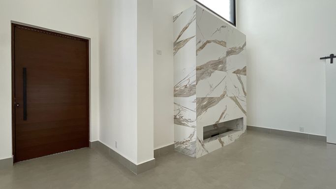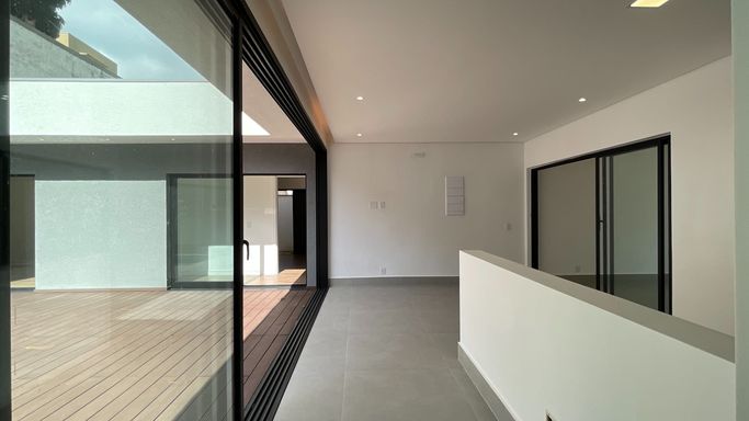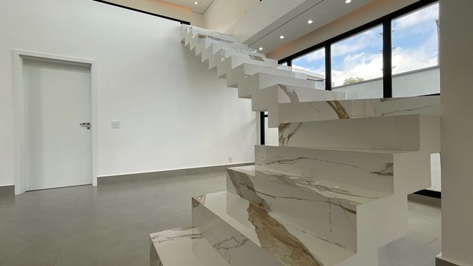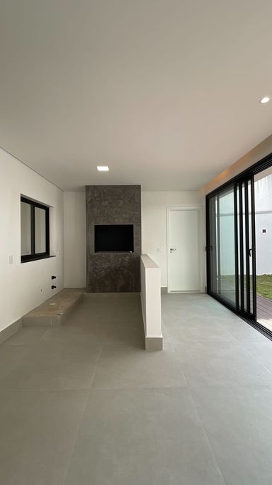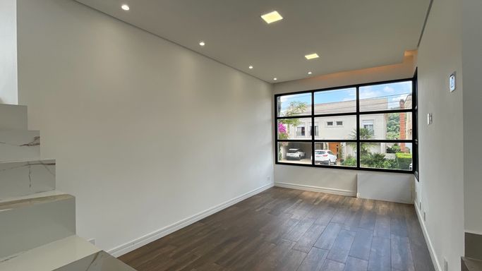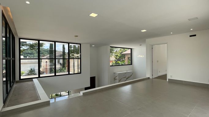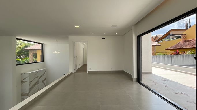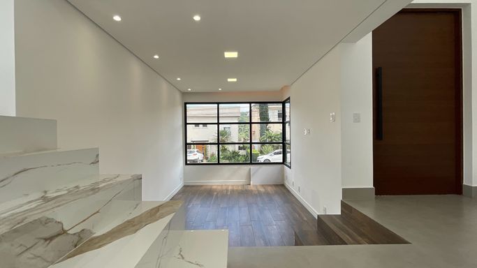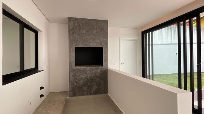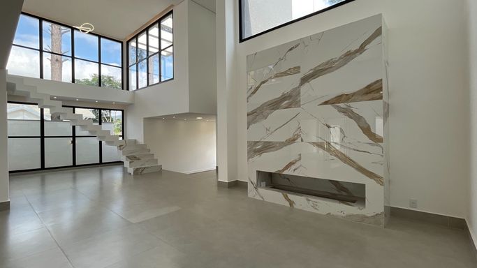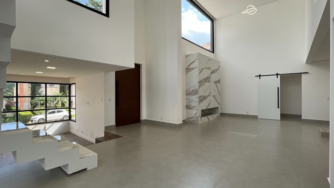 O hall de entrada conduz a salas bem distribuídas: estar, jantar e TV, todas iluminadas e com atmosfera acolhedora. A lareira adiciona charme e aconchego, enquanto o mezanino cria um espaço versátil para momentos de leitura, estudos ou home office.