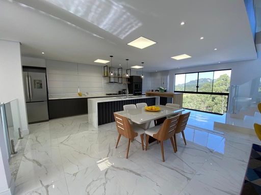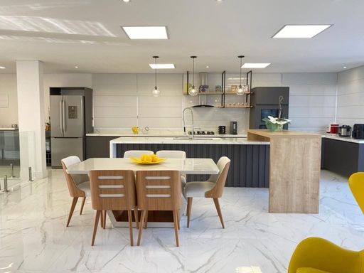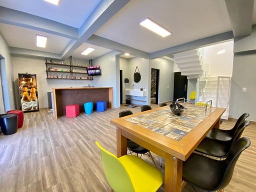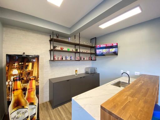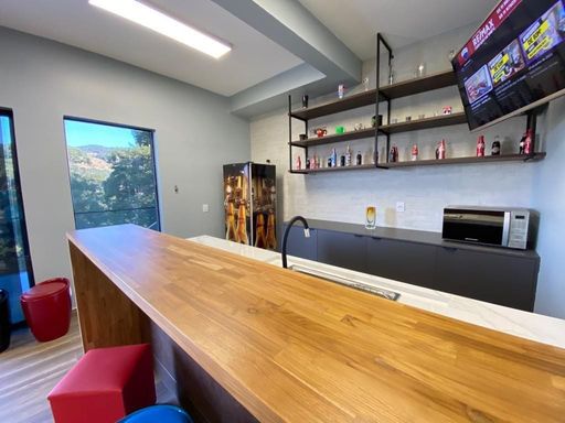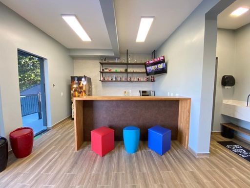 - Área gourmet de 80 m² fechada com vidro, bar e bancadas