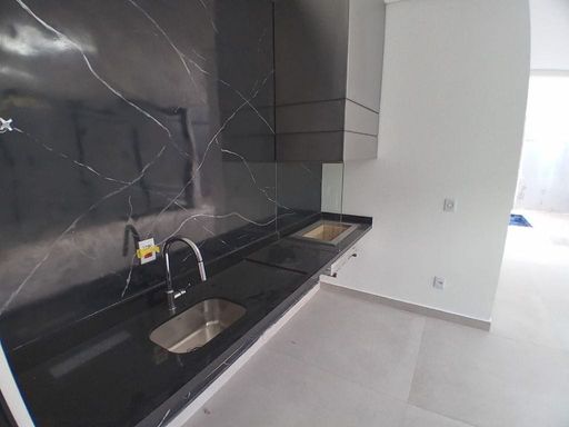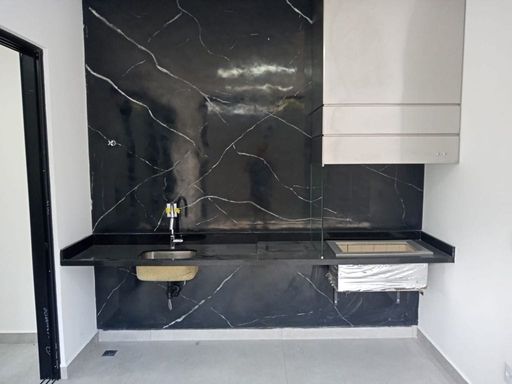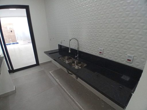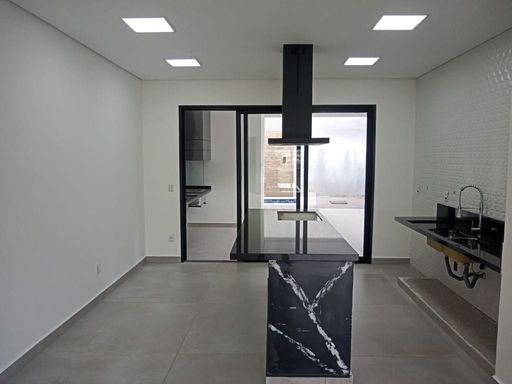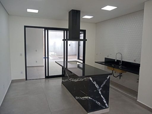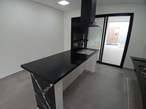 - Cozinha integrada às salas e área gourmet, com ilha central em granito preto