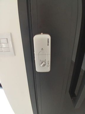- Entrada de luxo com porta preta moderna e fechadura digital