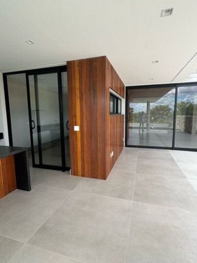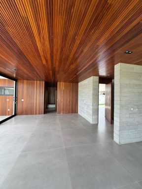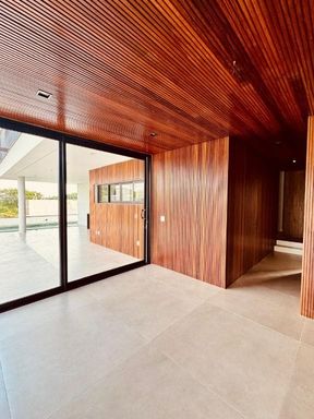 - Sala de estar e jantar com acabamento em madeira Cumaru no teto