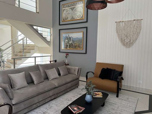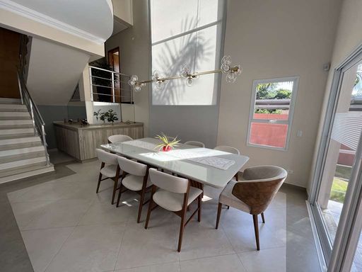 * Sala de estar com lareira e sala de jantar com pé direito duplo. Lavabo.