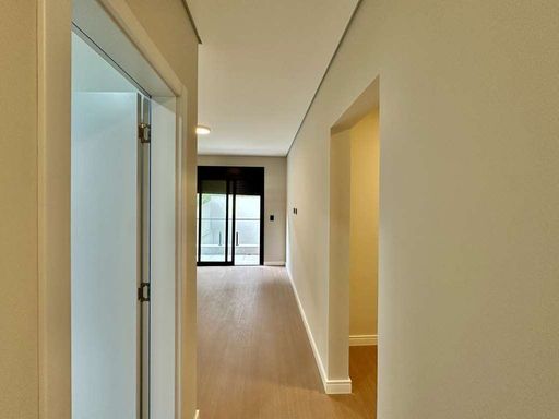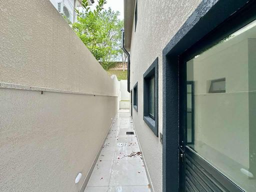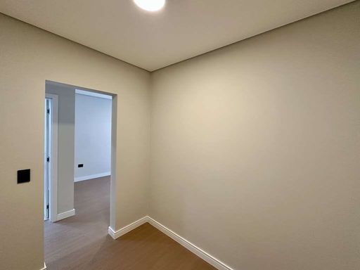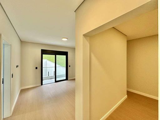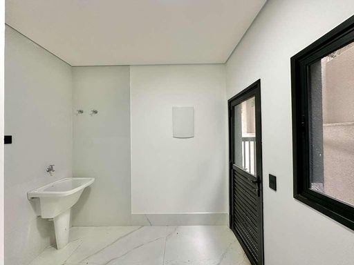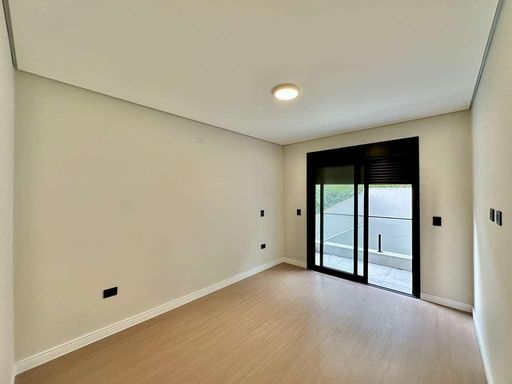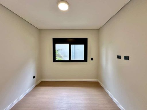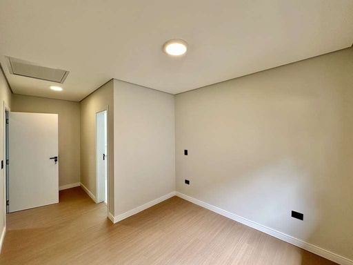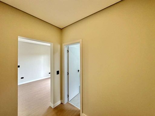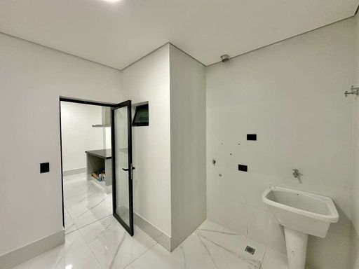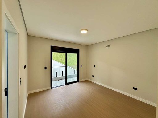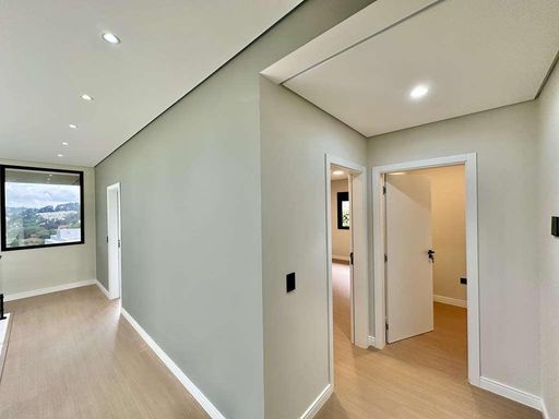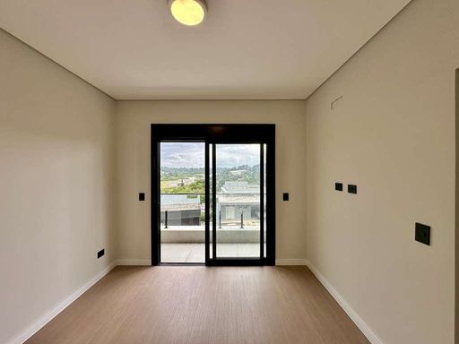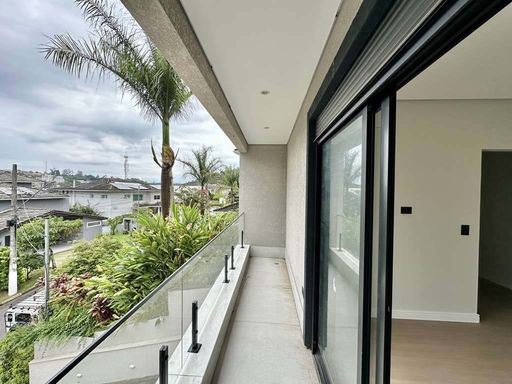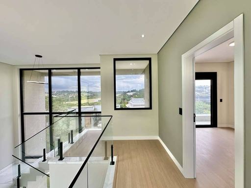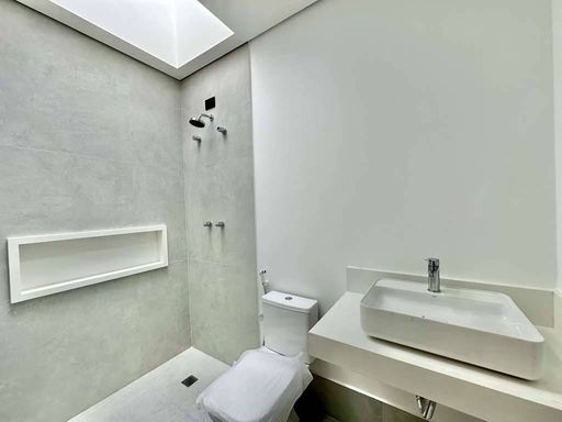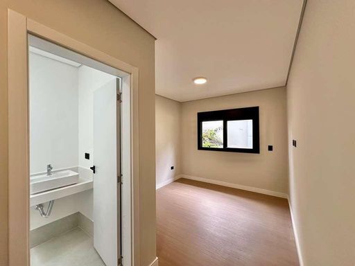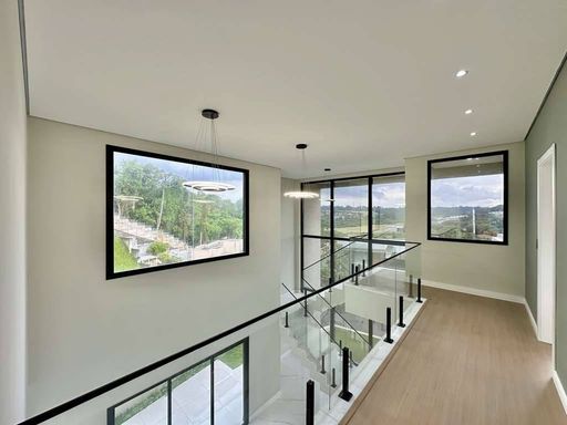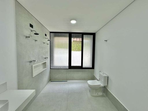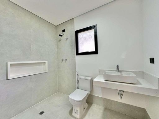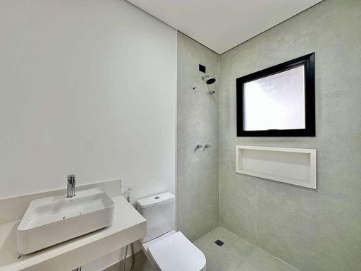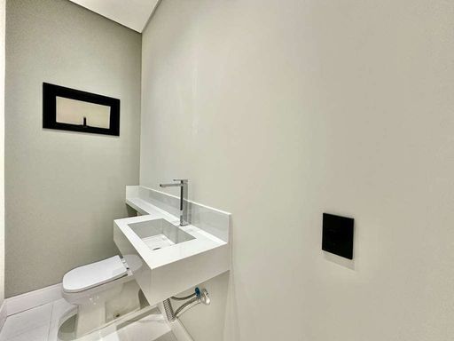 No piso superior, são quatro suítes, sendo três com closet e sacadas com guarda-corpo em vidro. A suíte máster é um verdadeiro destaque, com banheiro equipado com duas duchas. Toda a área íntima possui piso vinílico, garantindo conforto e praticidade. Os banheiros são revestidos em porcelanato, com nichos nos boxes, cubas sobrepostas e torneiras mono-comando.
