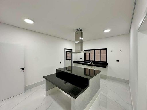 O living impressiona com pé-direito duplo, integração para três ambientes e piso em porcelanato, além de lavabo elegante. A cozinha conta com ilha central, tampos em granito preto e depurador em inox, conectando-se à varanda gourmet equipada com bancada, pia e churrasqueira. Nos fundos, amplo quintal gramado com espaço para piscina, ideal para lazer e convivência.