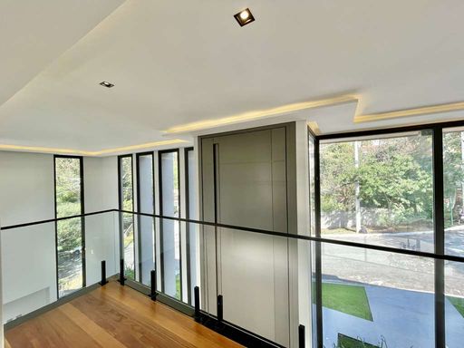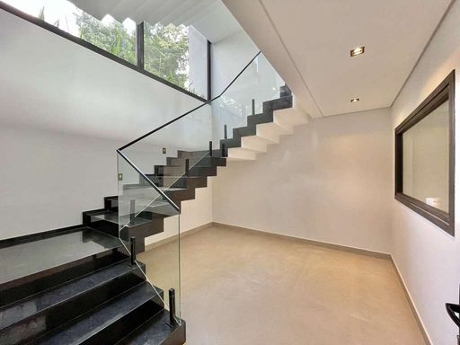 * Escada envidraçada em granito, iluminada, com guarda corpo de vidro.