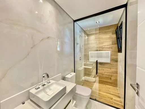* Banheiros com gabinetes, box de vidro até o teto com nichos e ralos horizontais, torneiras mono comando e vasos com duchas. Sendo a master com 2 cubas, 2 duchas de teto e hidro Jacuzzi dupla.