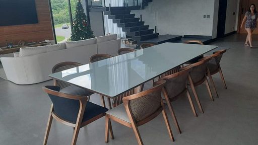 O living integra sala de estar, sala de jantar e sala de TV, criando um ambiente sofisticado e acolhedor para convivência e recepção. A área social é climatizada com dois aparelhos split de 36.000 BTUs, proporcionando conforto térmico em todas as estações.