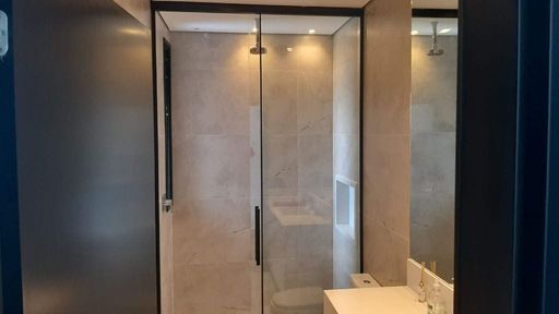 O imóvel conta com 5 suítes espaçosas, sendo uma localizada no pavimento térreo, ideal para hóspedes ou acessibilidade. Todas as suítes possuem persianas automatizadas e ar-condicionado, garantindo conforto e praticidade. A suíte master se destaca pelo amplo espaço e pelo elegante banheiro com banheira de hidromassagem, cuba dupla e chuveiro duplo.