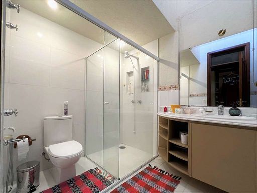 * Banheiros com bancadas em mármore, espelhos, gabinetes, box de vidro e nichos. Sendo a master uma sala de banho com 2 acessos, 2 espelhos, 2 cubas, 2 chuveiros, hidro, 2 vasos e aquecimento à gás, jardim interno.