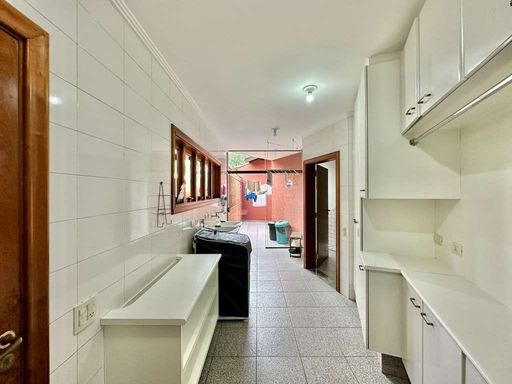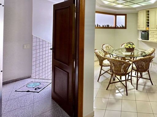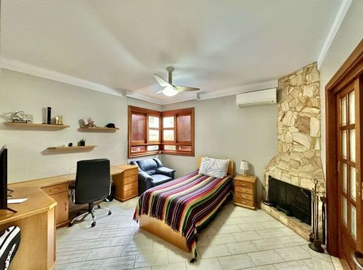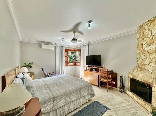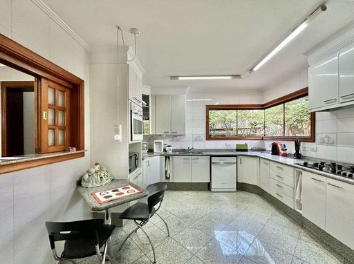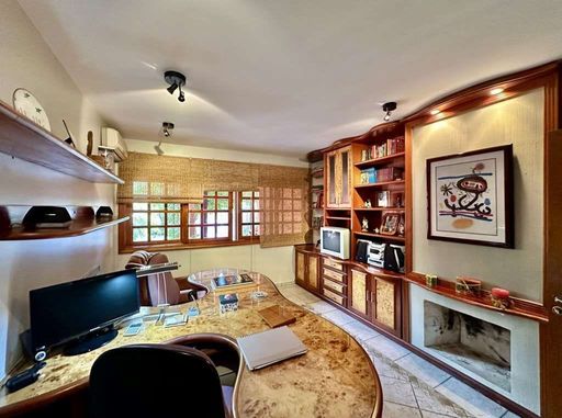 A cozinha é completa e funcional, repleta de armários planejados, ilha com balcão, duas cubas inox e despensa. O escritório, com lareira e ar-condicionado, abre-se para o jardim, criando um ambiente inspirador para trabalho ou leitura.