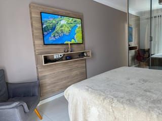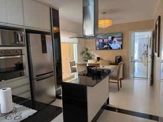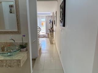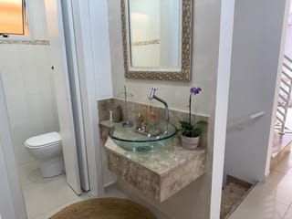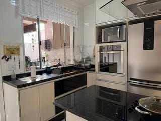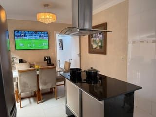 A cozinha planejada é um dos destaques do imóvel, equipada com ilha central e bancada, além de armários planejados que garantem organização e funcionalidade. O imóvel dispõe ainda de lavabo e banheiro social, atendendo perfeitamente às necessidades da área social e íntima.