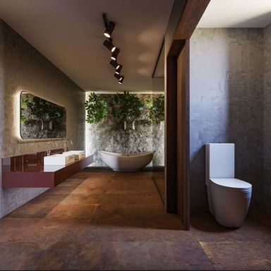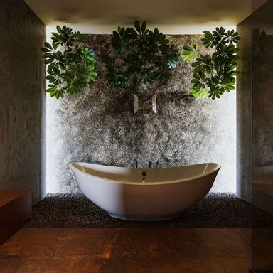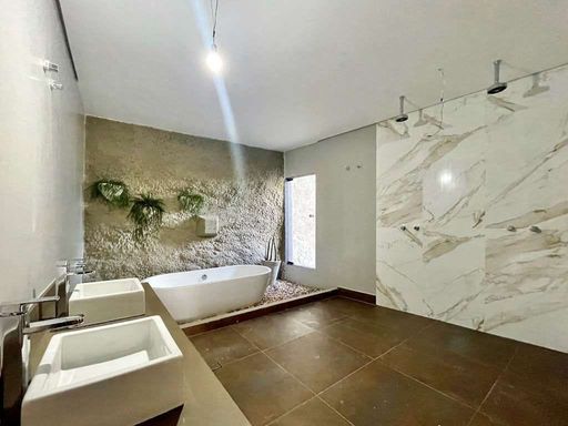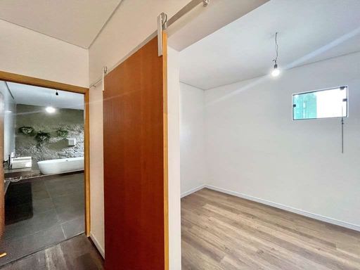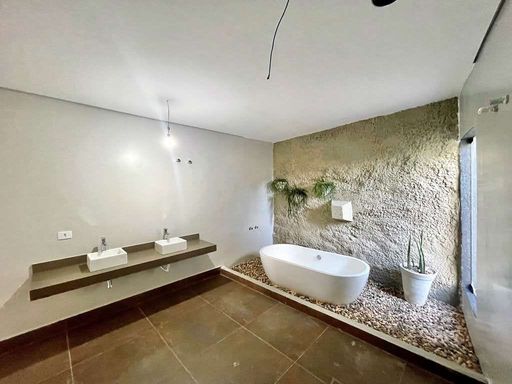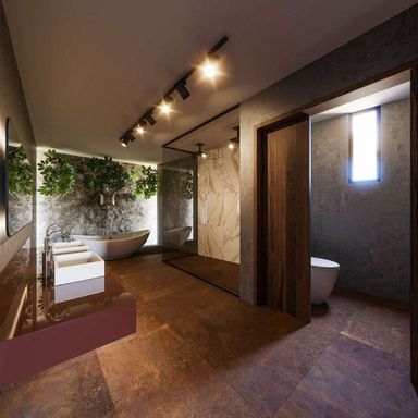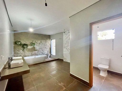 - Suíte master com sala de vestir, sala de banho, 2 cubas, banheira de imersão e parede em pedra natural.