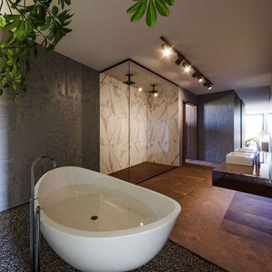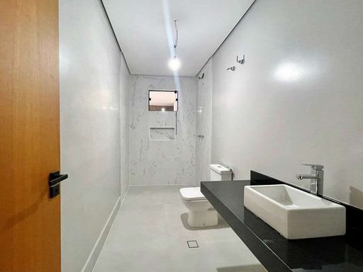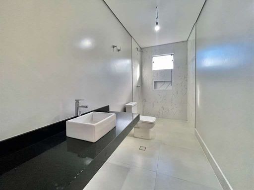 - Banheiros com bancadas em mármore e box de vidro.