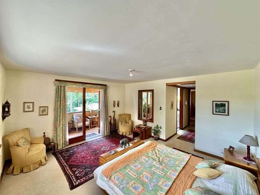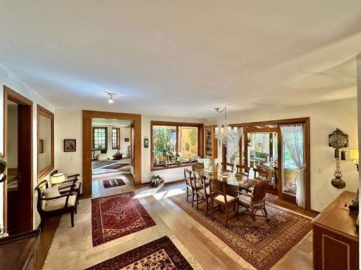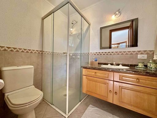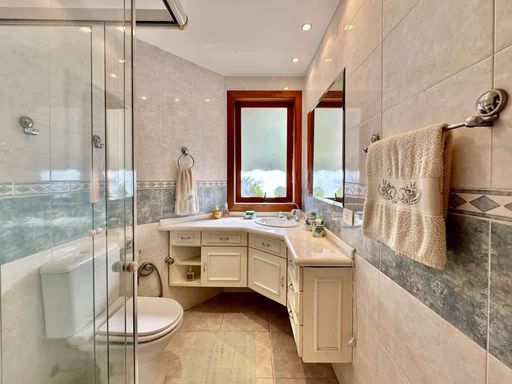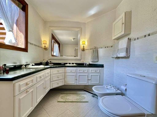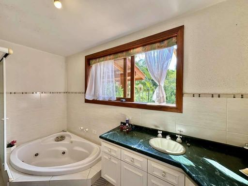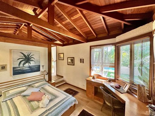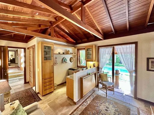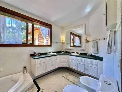 - 4 suítes com terraços, sendo 2 no térreo (uma delas em apartamento de hóspedes com saleta, cozinha e banheiro) e 2 no piso superior (master com escritório, saleta, closet sr. e sra., hidro e 2 cubas)