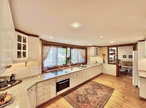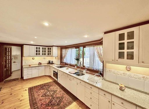 - Cozinha planejada com despensa, tampos em granito, cubas inox e piso em madeira
