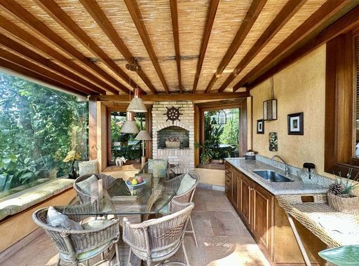 - Varanda gourmet integrada ao jardim e piscina, com churrasqueira, bancadas em granito e nicho para lenha/carvão