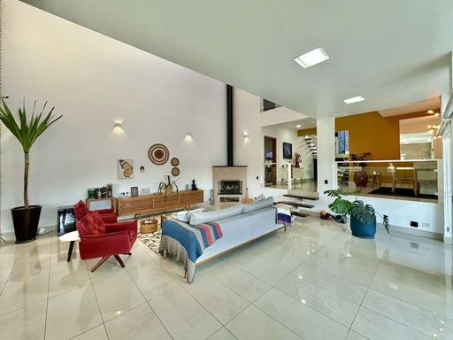 * Linda casa integrada, impecável e com ótimo acabamento. * Imóvel repleto de armários. * Portas e janelas em madeira e vidro. * Pisos em pedra mineira, revestimento de madeira, carpete, Miracema, cerâmica. * Telhas de concreto. * Jardim com paisagismo e frutíferas: amora, limão, jabuticaba, açaí, pitanga, romã, abacate manteiga, avocado, cúrcuma e café. * 4 acessos: social, lazer, garagem e serviço. * Hall de entrada social. * Escada revestida em madeira, com guarda corpo de madeira. * Family room. * 5 suítes com armários, sendo a master com bay window, closets sr e sra, terraço e vista. * Banheiros com tampos em mármore, gabinetes, espelhos, box de vidro e jardinzinho, sendo a máster com hidro. * Escritório. * Salão de Jogos/TV. * Living para 4 ambientes voltados para varanda gourmet, quintal com lazer e jardim. * Estar, lareira, TV, bar e jantar mais reservada. * Sala de almoço com lavatório. * Cozinha repleta de armários planejados, bancada com 2 cubas inox, balcão, gabinetes e despensa. * Área de serviço aberta ensolarada e lavanderia fechada com 2 tanques e armários. * Suíte de serviço com acesso externo. SALÃO DE FESTAS GOURMET com churrasqueira, forno, bancada, pia, 2 cubas inox, balcão e despensa. * Vestiário. * 2 Piscinas: 1 piscina octogonal e outra piscina para prática de Biribol com 10m x 3,5m. * Pça do Fogo. CASA DE HÓSPEDES * Living para 4 ambientes. * Estar/TV, lareira, jantar, escritório. * Varandinha com bar. * 2 quartos, sendo 1 com armário, * 1 banheiro com chuveiro elétrico. * Cozinha, pia inox, gabinetes. * Espaço horta. * Canil. * Portão automático. * Garagem para umas 10 vagas, sendo 5 cobertas. * Aquecimento: Boiler elétrico. * Abastecimento de água: Sabesp e poço caipira para uso externo. * Armazenamento: 5.000 litros. AGENDE JÁ SUA VISITA!