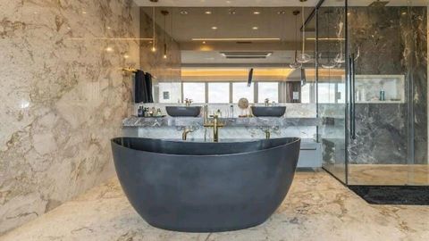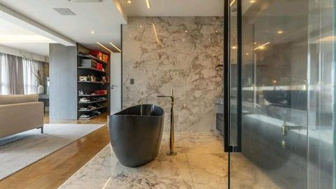 - Suíte principal com vista panorâmica, closet, home office, banheira, pias e chuveiros duplos