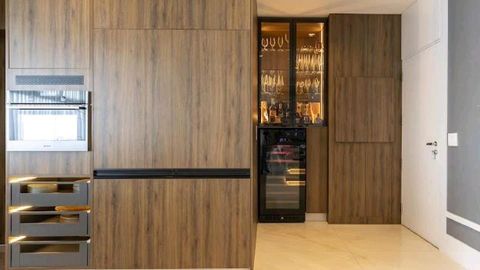 - Cozinha planejada Florence equipada com eletrodomésticos Gorenje embutidos e bancada em Ônix