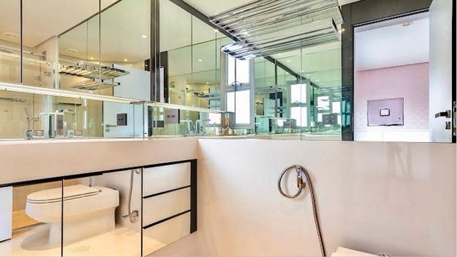 Na área íntima, a suíte master oferece um verdadeiro ambiente de conforto e exclusividade, com banheiros Sr. e Sra. e closets independentes, ambos com espelhos e acabamentos refinados em preto e dourado. Os banheiros sociais apresentam projetos diferenciados, com design contemporâneo que combina mármore, espelhos e elementos artísticos.