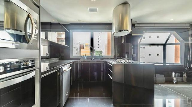 A cozinha gourmet alia design moderno e funcionalidade, com ilha central, cooktop, coifa cilíndrica em inox, eletrodomésticos embutidos e bancadas em acabamento premium, além de amplas janelas que proporcionam excelente iluminação natural.