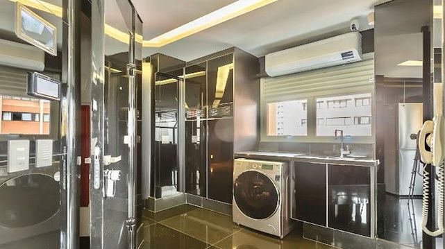 O apartamento conta ainda com dependência completa de serviço, lavanderia funcional com armários planejados e áreas íntimas com acabamentos sofisticados, que reforçam o padrão elevado do imóvel.