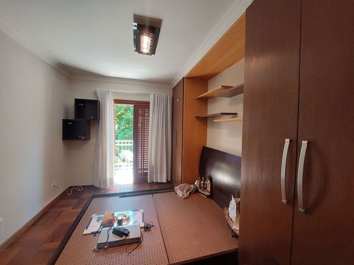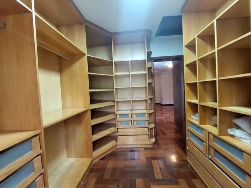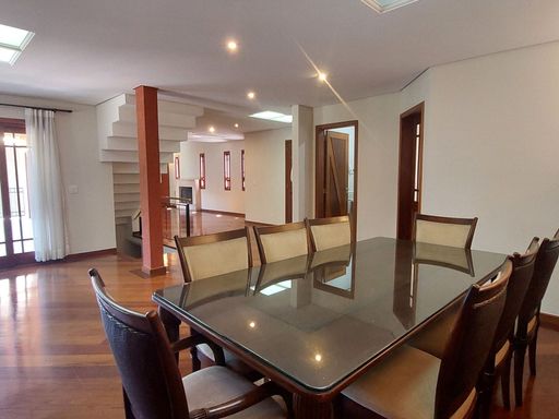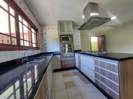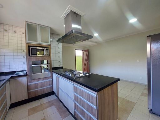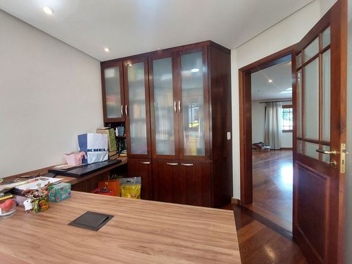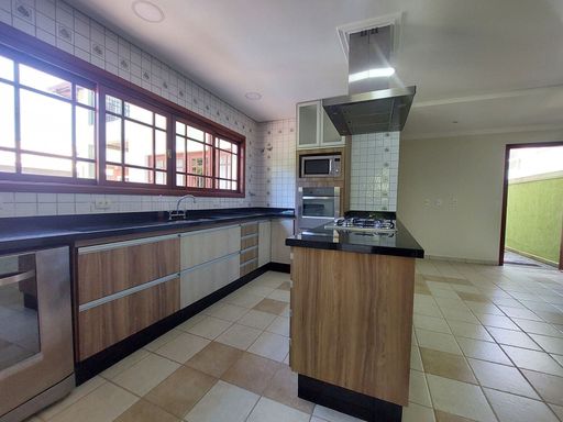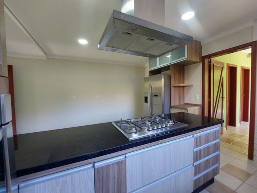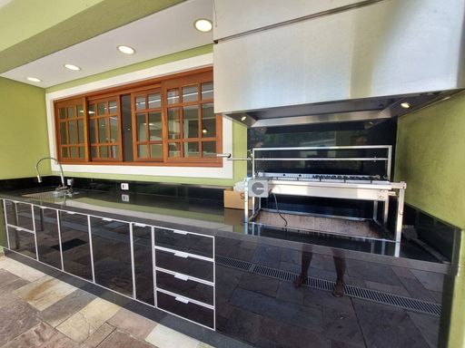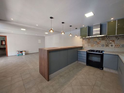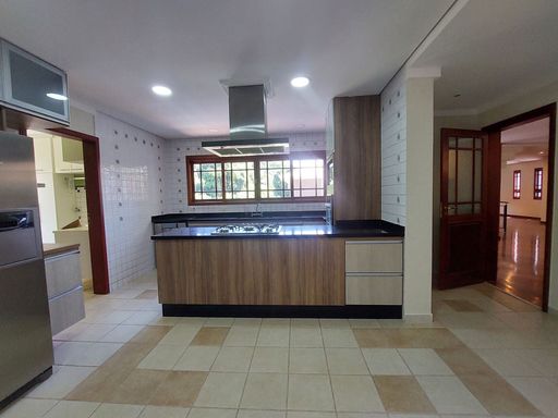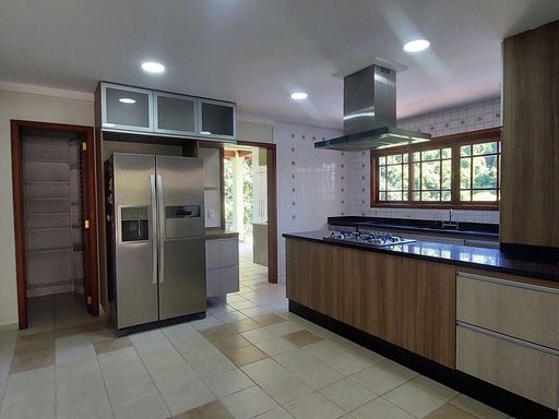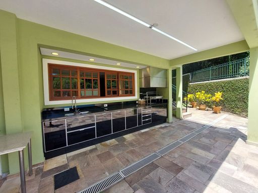 A cozinha planejada, com armários de alto padrão, integra-se à copa e aos espaços sociais, criando um ambiente prático e acolhedor. O imóvel conta ainda com lavabo, rouparia e dependência completa para funcionários, garantindo praticidade e organização.