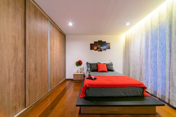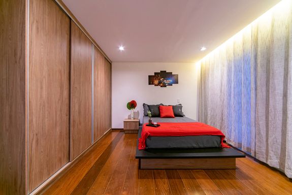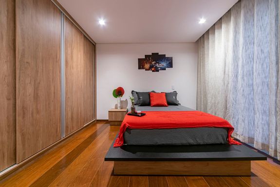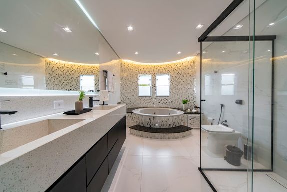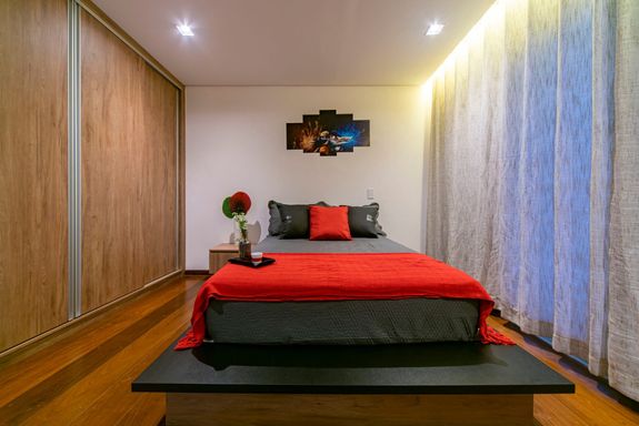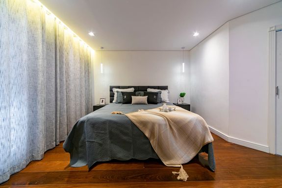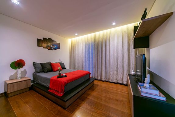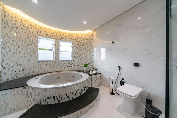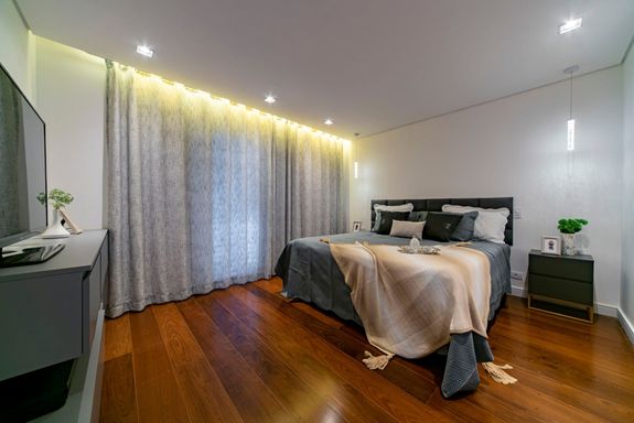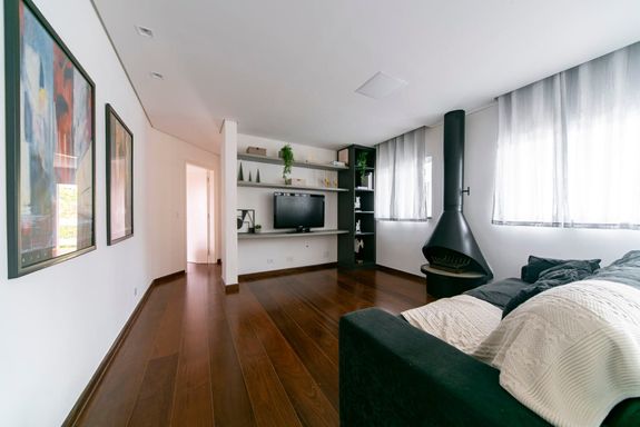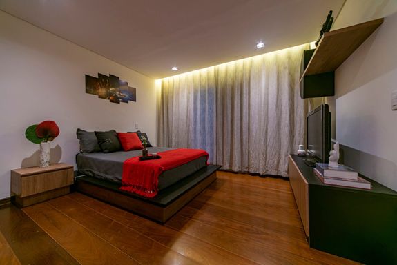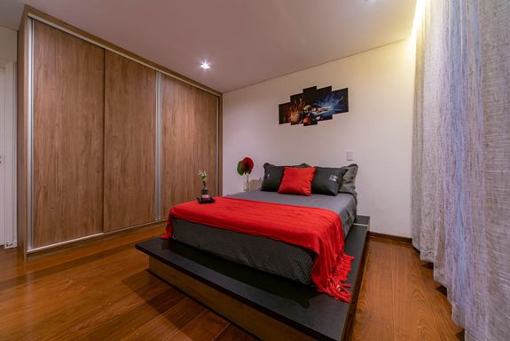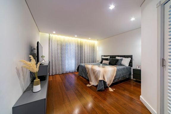 No piso superior encontra-se a ala íntima, composta por quatro dormitórios generosos, todos com armários planejados, varandas e excelente ventilação. A suíte máster é ampla e sofisticada, com closet e banheira, enquanto a suíte de hóspedes também dispõe de banheira, garantindo conforto e privacidade.