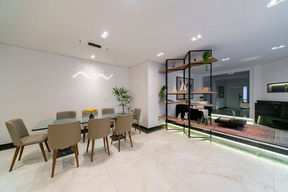 A cozinha é ampla e moderna, equipada com ilha central, sala de almoço, despensa e armários planejados, com acesso direto à área de serviço coberta e dependência para funcionários. Ainda no piso inferior, há espaço reservado para adega, ideal para apreciadores de vinhos.