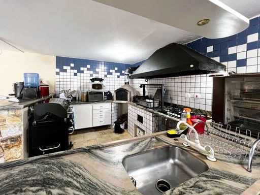 - Anexo gourmet/salão de festas para 5 ambientes (refeições, estar, TV, bar e jogos), com churrasqueira, forno de pizza, forno elétrico, bancadas, pia inox e gabinetes