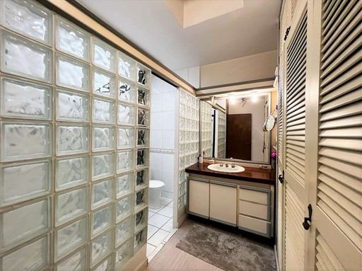 - Banheiros com tampos de madeira, espelhos, gabinetes e box de vidro