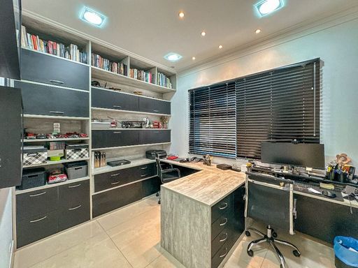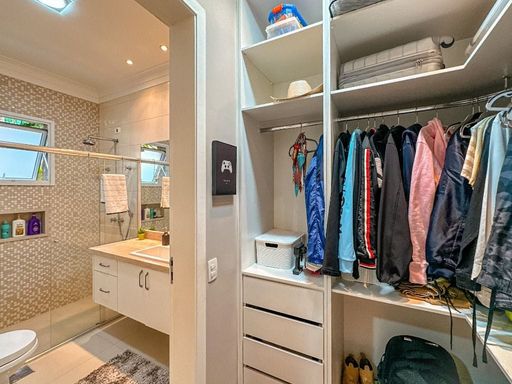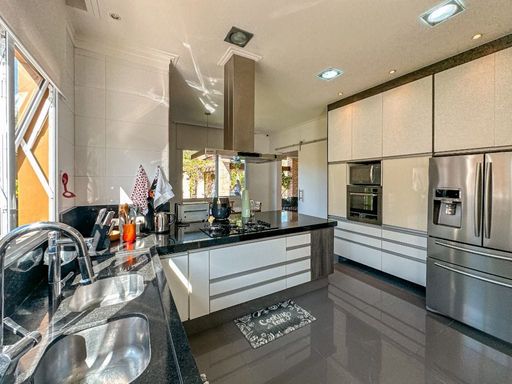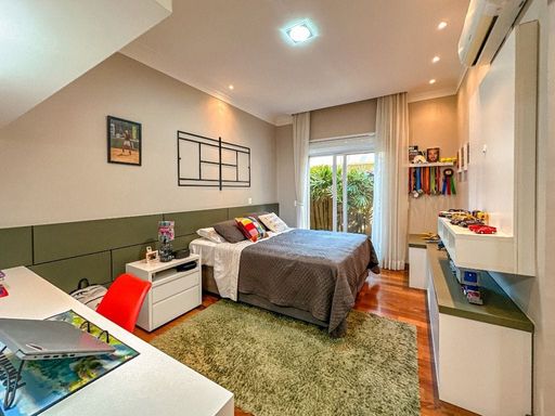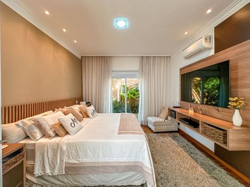 A cozinha planejada, equipada com balcão e despensa, alia praticidade e estilo. São quatro suítes, todas com closet e ar-condicionado, sendo três localizadas no térreo e voltadas para o jardim privativo, além de uma suíte no andar superior, perfeita para hóspedes. O depósito no piso superior oferece espaço adicional para armazenamento.