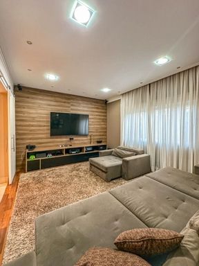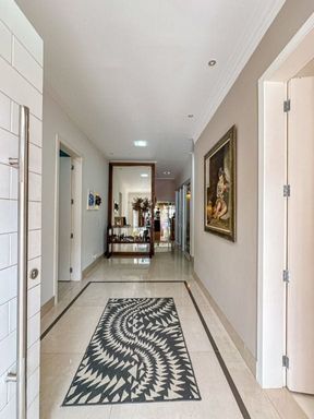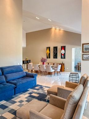Os amplos envidraçados proporcionam iluminação natural abundante e ventilação cruzada, enquanto o ar-condicionado em todos os ambientes e persianas eletrônicas garantem comodidade e sofisticação. O living com pé-direito duplo conecta harmoniosamente as áreas de estar, jantar e cinema/TV, criando um espaço acolhedor e elegante.