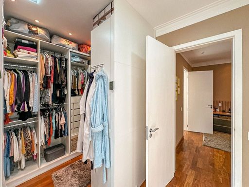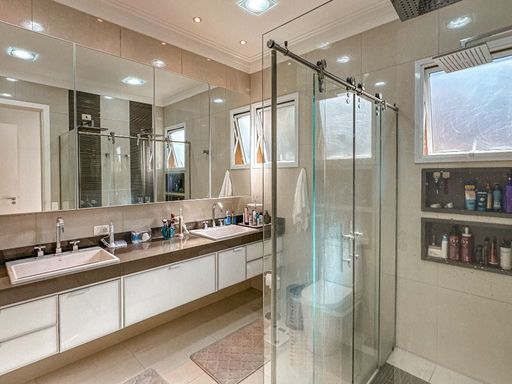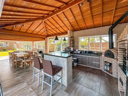 Na área externa, o lazer é completo: piscina em alvenaria aquecida, jacuzzi para oito pessoas, vestiário completo e um sofisticado salão de festas gourmet com churrasqueira e forno de pizza. A edícula para hóspedes dispõe de sala, cozinha, quarto e banheiro, complementada por lavanderia com armários planejados e dependência de serviço em suíte.