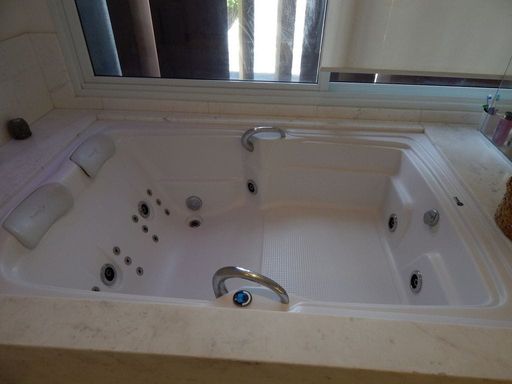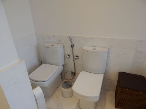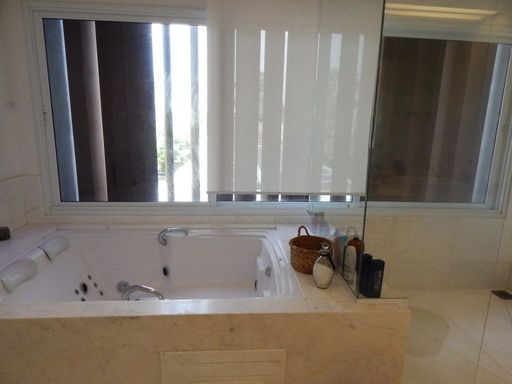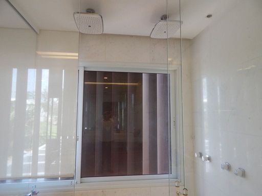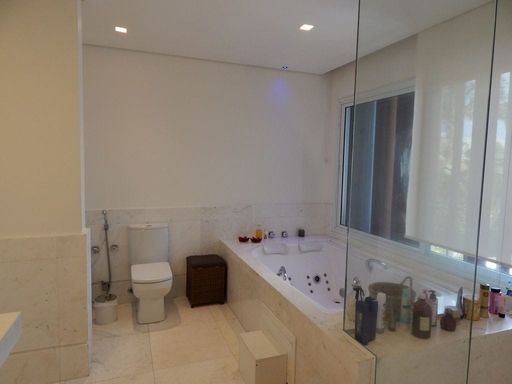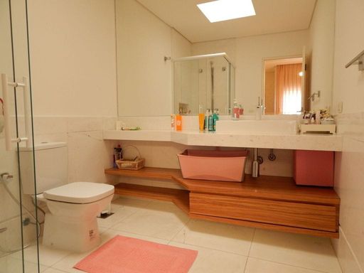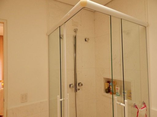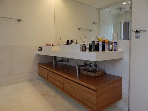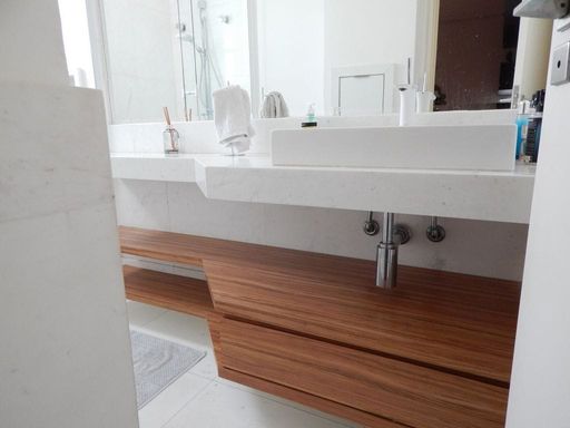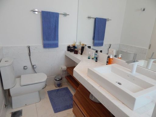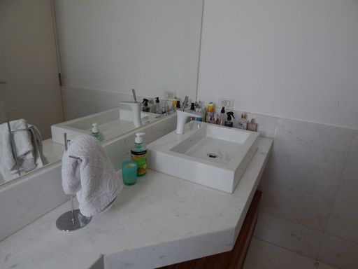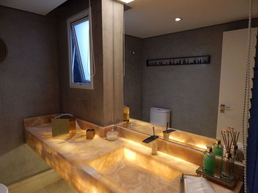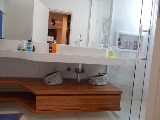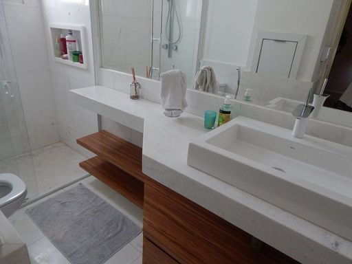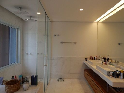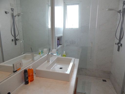- Banheiros revestidos em mármore, box de vidro até o teto, excelente iluminação natural. Máster com 2 cubas, 2 chuveiros, 2 vasos e hidro dupla.