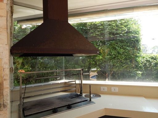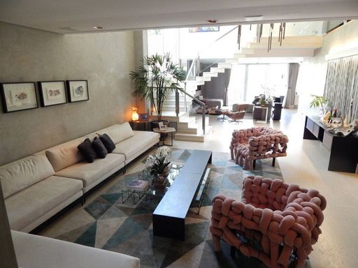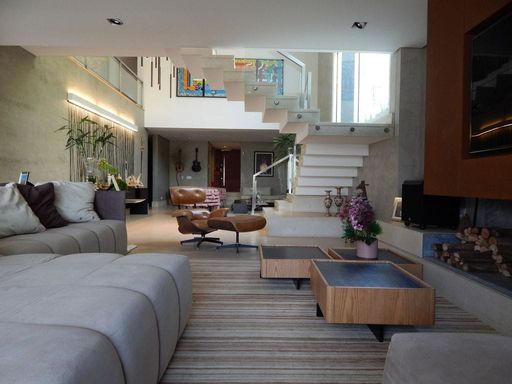 - Living com pé-direito duplo: jardim vertical integrado e 4 ambientes — estar, lareira à lenha, TV e jantar para 10 pessoas — conectados à cozinha, varanda e área de lazer.